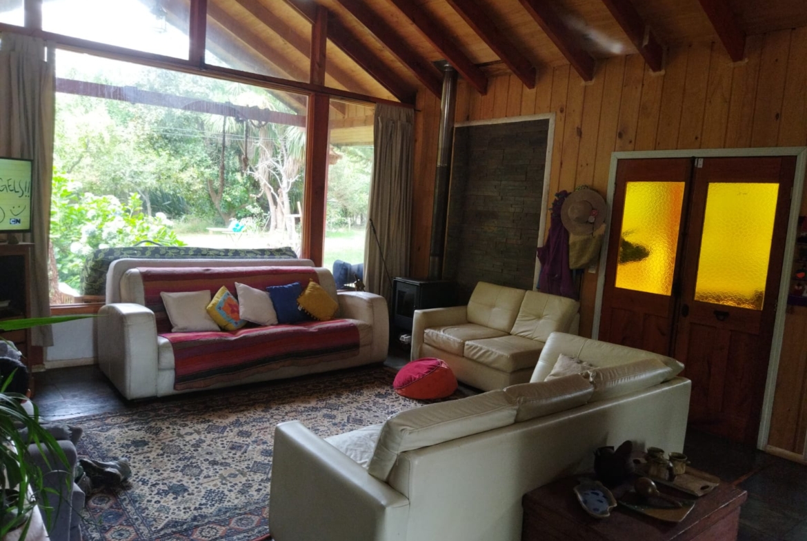 Pero eso no es todo. La propiedad cuenta con dos casas, una piscina, un galpón y una bodega, además de un parque con amplios y hermosos jardines con árboles ornamentales y frutales que brindan abundante sombra. La casa principal de 164 m2 cuenta con tres dormitorios, dos baños, living, comedor y cocina americana, y una hermosa terraza de aproximadamente 72 m2. La segunda casa posee dos dormitorios, un baño, cocina, living-comedor y una terraza de 30 m2. Cuenta con energía eléctrica de la red pública, agua de noria y una vertiente de agua pura y cristalina inagotable.